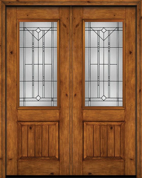 WDMA 72x96 Door (6ft by 8ft) Exterior Knotty Alder 96in Alder Rustic V-Grooved Panel 2/3 Lite Double Entry Door Riverwood Glass