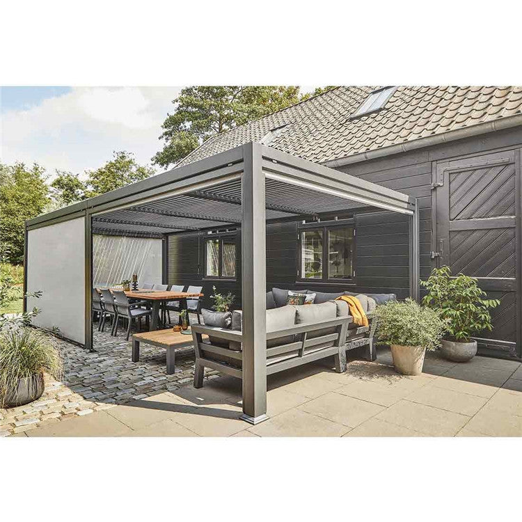 Type:Arches, Arbours, Pergolas & Bridge Place of Origin:Guangdong, China Metal Type:Aluminum Feature:Easily Assembled, ECO FRIENDLY, Renewable Sources, Waterproof Material:Extruded Aluminum Alloy (6063-T5) Color:grey, white, black or customized Size:grey, white, black or customized Surface treatment:powder coated Warranty:10 years Operation:Motorized (remote Control) Sensor system available:Rain Wind Sensor Application:Dining/Bar/Relaxation/Swimming pool etc. Wind load...