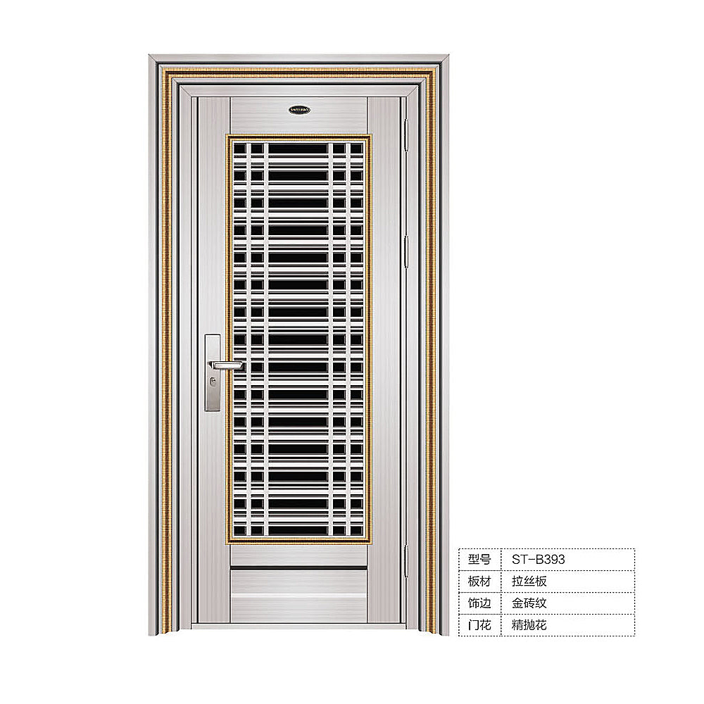 Stainless steel security titanium security door Manufacturer: Foshan Shengtian Doors Co., Ltd Item No.: ST-B393 Feature: Anti-rust,Anti-burglary,Anti-pry,sound-proof, Long lifespan, Modern design, Double leaf Brand: Shengtian or OEM Main material: 304 stainless steel Decorative material: 8K stainless steel & depression bar, hairline surface finished, 4mm double tempered glass Infilling material: Mostly infill with foam board , but no infilling material in seamless door Thickness of door leaf 70mm,90mm or customized Thickness of door leaf panel: 0.7-0.8mm or customized Thickness of door frame: 1.0-1.2mm or customized Structure of frame: Welded or Seamless Size(mm): 2, 050 x 960mm, 2, 050 x 900mm, 2, 050 x 860mm , or customized Open style: Swing Open direction: Left/Right , Inward/Outward Lock design: Multipoint Machinery Security Lock, fingerprint lock Accessories: Hinges, locks, handles, viewer, doorbell, rubber seal, installing bolts Packing: Foam + hard paper carton + fixed by wood Payment terms: 1) 30% deposit, balance 70% pay before loading; 2) 30% deposit, balance by Letter of Credit at sight Lead time: 15-20 days after received deposit Loading port: Foshan Port/ Shenzhen port/ Guangzhou port ...